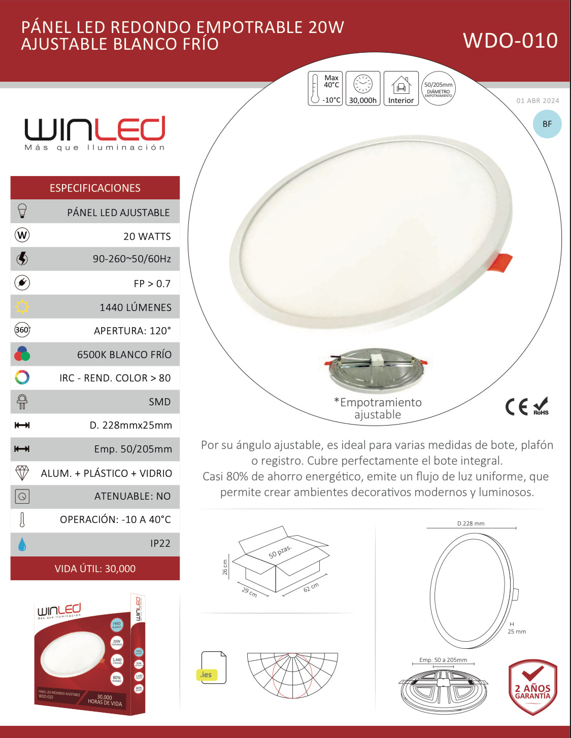 PÁNEL LED REDONDO EMPOTRABLE 20W AJUSTABLE BLANCO FRÍO WINLED WDO-010