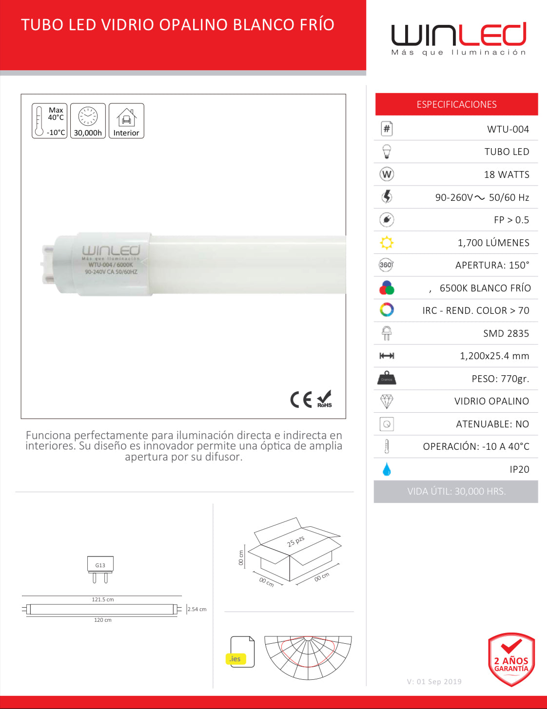 TUBO LED VIDRIO 1.2MTS 18W OPALINO WINLED WTU-004